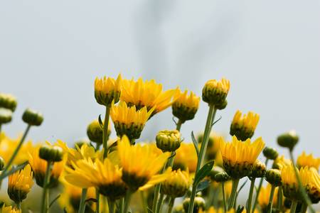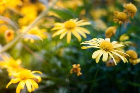 Yellow chrysanthemum flowers blooming in the field, soft focus