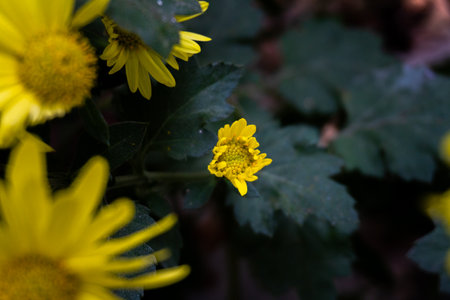 yellow chrysanthemum flowers with green leaves, in the open field, close-up