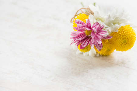 Fresh flowers bouquet on a white wood rustic background and bright sunny light