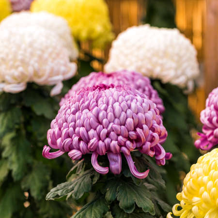Beautiful colorful chrysanthemums in a closed Japanese garden. Close-up