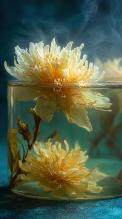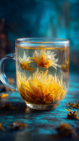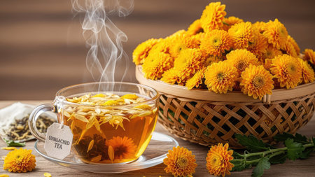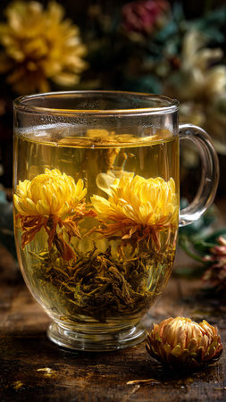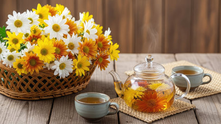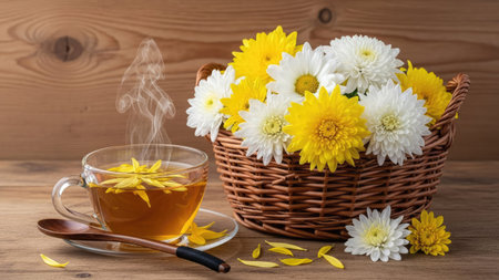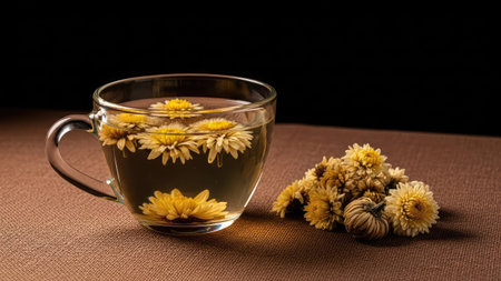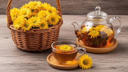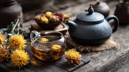 An authentic and moody still life of a traditional herbal tea ceremony. A glass cup of chrysanthemum tea and a dark ceramic teapot are set on a rustic wooden table with fresh yellow flowers, emphasizing wellness and tranquility.