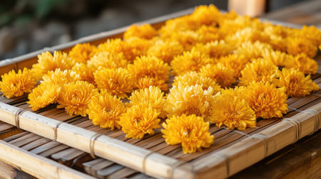 A captivating display of vibrant yellow chrysanthemum flowers arranged on a bamboo tray, showcasing their beauty and intricate details in a serene setting.
