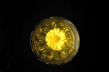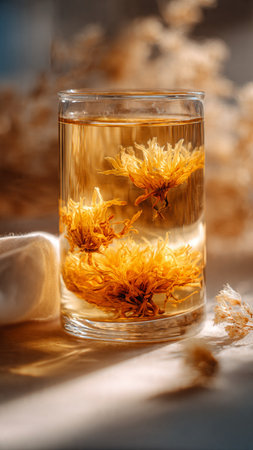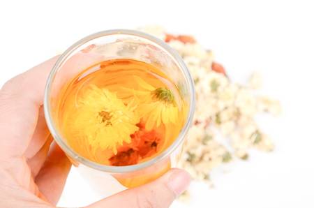 Herbal tea with chrysanthemum flowers in glass cup