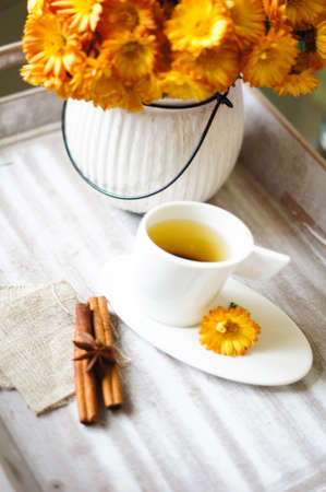 Cup of tea with cinnamon and anise star with autumnal flowers on the wooden table