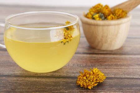 Cup of herbal tea with chrysanthemum on wooden table