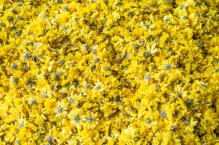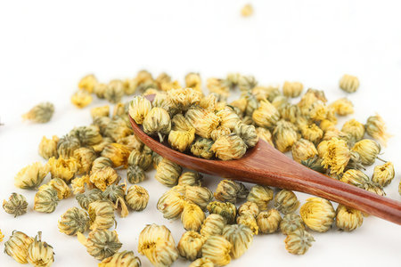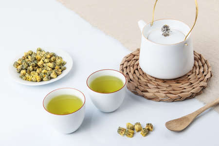 Dried chrysanthemum flowers on white background. Herbal tea.