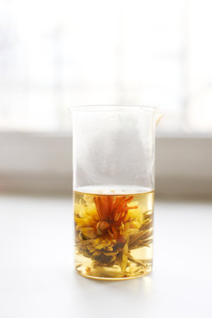 Glass beaker with blooming flower tea infusion against soft light background.