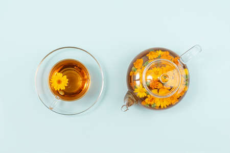 Cup of herbal tea and transparent teapot with calendula flowers on blue background. Calendula Tea Benefits Your Health concept. Top view Flat lay.