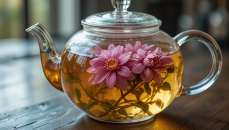 Fragrant herbal tea with floating pink flowers in a clear teapot creates a serene atmosphere on a wooden table.