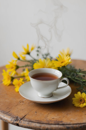 Steaming cup of tea sits on a wooden tray, accompanied by vibrant yellow flowers and a tranquil ambiance