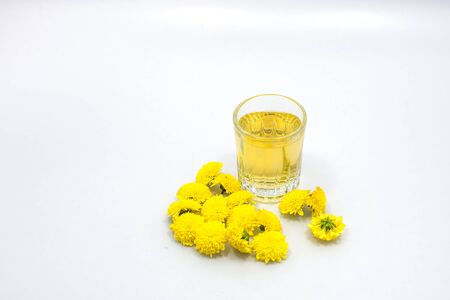 A glass cup with marigold flower petals on white background. Flower herbal tea concept.