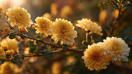 The Garland chrysanthemum at dawn soft golden sunlight kissing leaves clean air natural color
