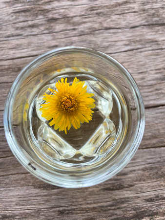 Glass of water with dried flowers on the table. Close-up