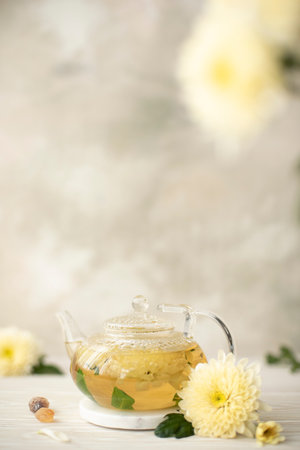 Chrysanthemum tea in a glass teapot on a wooden background