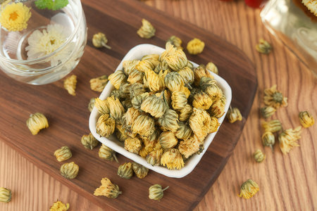 Dried chrysanthemum tea in a bowl on wooden table