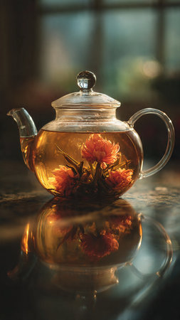 A close-up shot of a glass teapot with a blooming tea flower. The flower is a vibrant orange, surrounded by green tea leaves, steeping in hot water. Steam rises, creating a warm, inviting atmosphere.