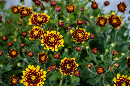 yellow and orange chrysanthemums on a blurry background. In autumn, beautiful bright chrysanthemums bloom luxuriantly in the garden.