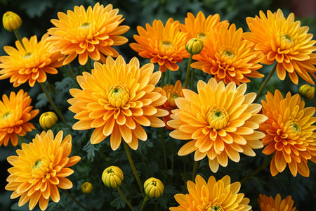 Beautiful orange chrysanthemums in green leaves. Bush of autumn chrysanthemums. Garden plants, growing flowers.