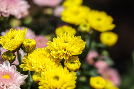 Yellow and pink chrysanthemums in the garden. Autumn Flowers. High quality photo