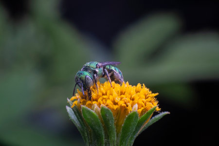 Agapostemon splendens (Metallic Green Bee) perched on the beautiful flower.