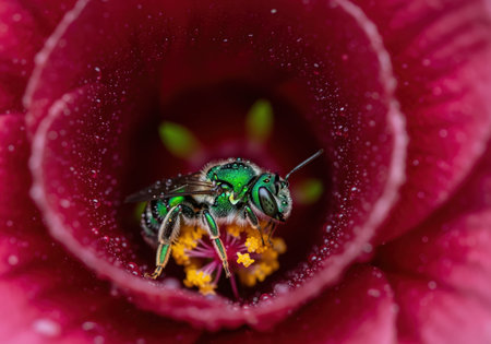 Extreme macro photograph showcasing a jewel toned metallic green sweat bee resting deep inside the velvety crimson petals of a flower, covered in tiny water droplets.