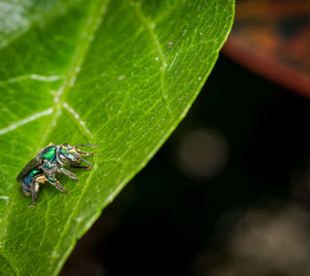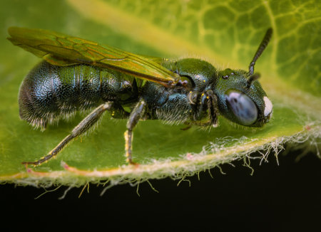 Macrophotography of a small Carpenter Bee (Ceratina Calcarata). Close-up and details.