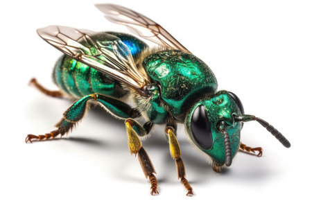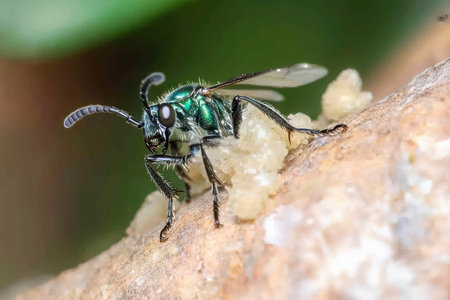 Vibrant emerald green jewel wasp with blue highlights on a branch. Small yet deadly creature with a powerful sting. Ideal for showing wildlife, nature, and macro photography.