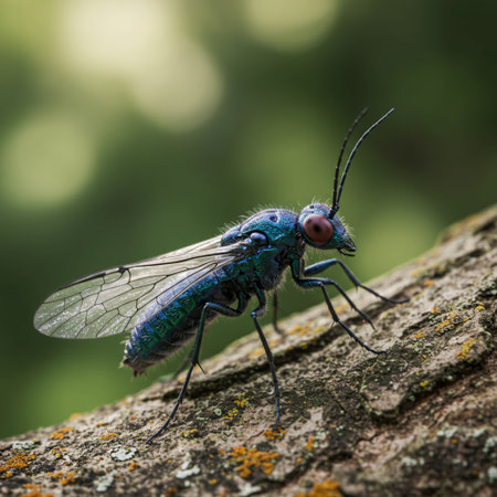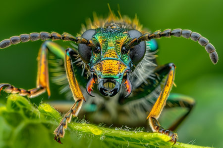 Close up of a vibrant insect showcasing intricate details, vivid colors, and captivating textures ideal for nature and science illustrations
