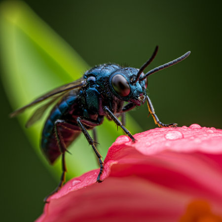 Close-Up of Striking Winged Insects on Vibrant Flower Blooms with Tiny Dew Drops Sparkling