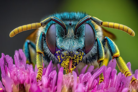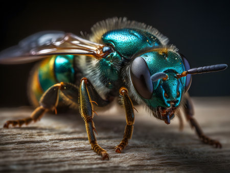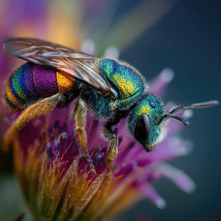 A vibrant bee, displaying iridescent hues of green, blue, and purple, is captured in exquisite detail. The image showcases the bee's intricate textures and delicate wings while it interacts with a soft-focus flower. The composition suggests a natural environment, potentially outdoors, with diffused lighting. This image could be used for educational, scientific, or decorative purposes.