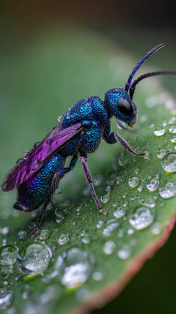 An iridescent blue insect with purple wings rests on a vibrant green leaf covered in water droplets. The macro photography highlights the texture and detail of the insect and leaf. This image, with its natural lighting and close-up perspective, is suitable for various commercial uses, including editorial and design projects.