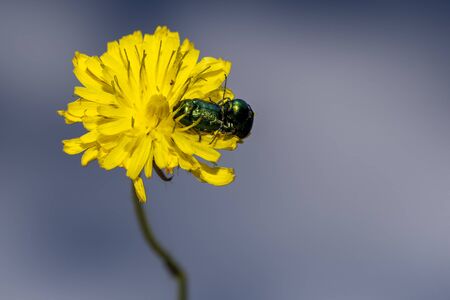Cryptocephalus sp green beetle while mating on yellow dandelion flower