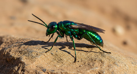Iridescent Emerald Cuckoo Wasp Chrysididae Macro Shot on Textured Sandstone Rock