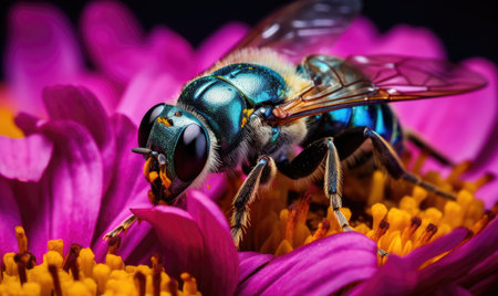 Detailed macro photograph of a bee gathering pollen on a colorful flower in a close up perspective