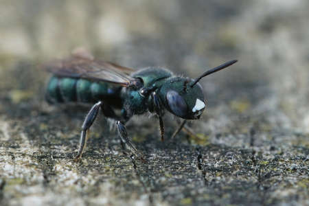 Detailed closeup on a female little blue carpenter bee, Ceratina cyanea on a piece of wood in Southern France