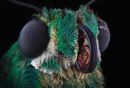 Portrait of green skipper butterfly from Dominicana through a microscope. Astraptes habana.