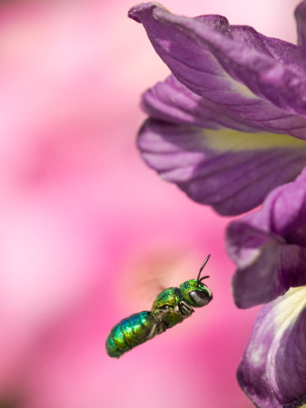A macro shot of a glitter wasp flying near a purple flower against a blurred background
