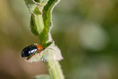 A shiny black and orange beetle explores a green plant stem, showing its vibrant colors against the backdrop of a blurred garden. The insect moves slowly, feeding on nearby foliage.