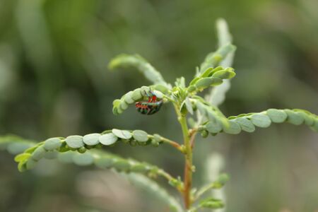 Close up photo of red cucurbit leaf bug on leaf