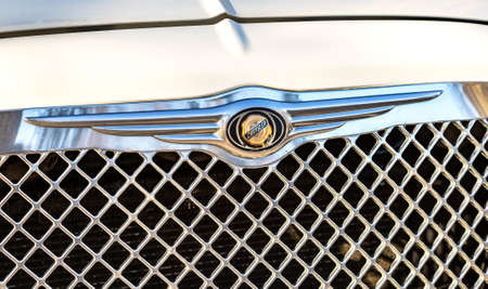 Samara, Russia - October 27, 2020: Close up view of emblem of Chrysler vehicle. Logo of Chrysler vehicle