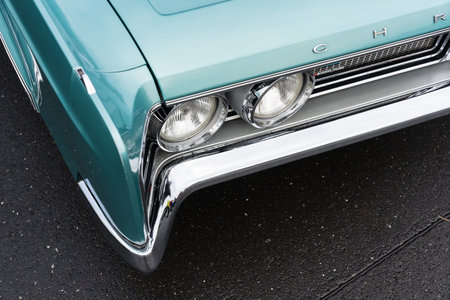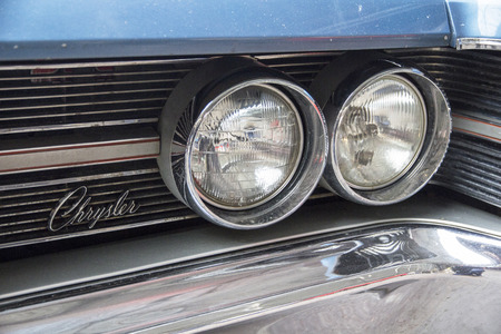 LINTHE, GERMANY - JUNE 08, 2025: The front corner detail with dual headlights and chrome bumper of Chrysler Newport classic sedan, 1967. Die oldtimer show.
