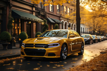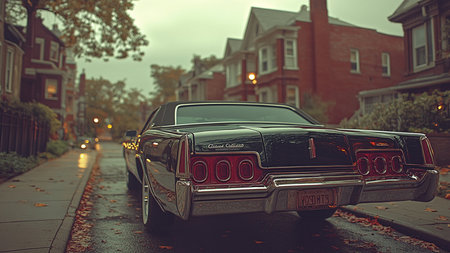 A vintage car parked in the street with rays of sunlight created with Generative AI