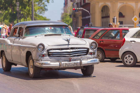 CUBA, HAVANA - MAY 5, 2017: American gray retro car on city street. Copy space for text