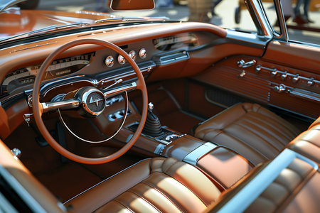 An AI-generated illustration of a retro car' shiny metallic surface in sunlight.