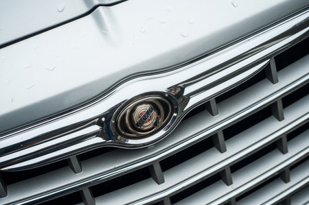 Mulhouse - France - 29 October 2019 - Closeup of Chrysler logo on grey car front parked in the street