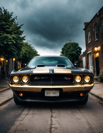 Classic muscle car under dramatic cloudy sky