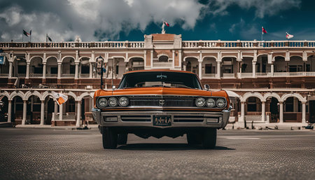 A classic car parked in front of a beautiful, historical building. The car is an orange vintage model with a chrome grille, and the building is a large, elegant structure with arched windows and balconies.