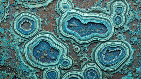Abstract close-up of layered mineral formations in turquoise and brown hues, showing intricate concentric patterns and textures.
