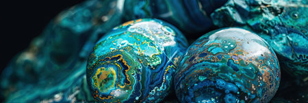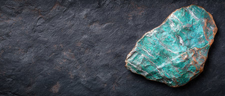 Fornacite is rare precious natural geological stone eremite on black background in low key. Fashionable jewelry elegant decoration. AI generated. Header banner mockup with space.