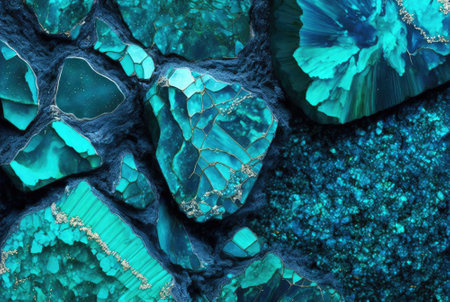 Close-up view of shimmering turquoise and emerald green crystals reveals an enchanting interplay of light and reflection, creating a beautiful bokeh effect that mesmerizes the eye.